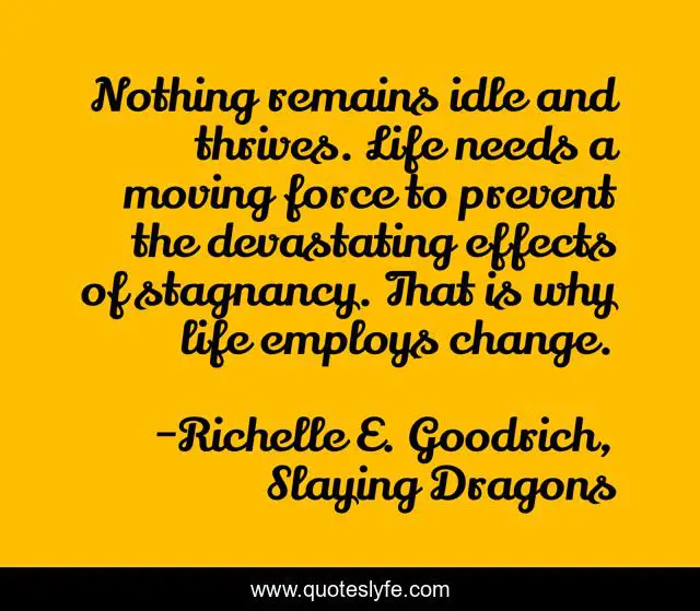 This page presents the quote "Nothing remains idle and thrives. Life needs a moving force to prevent the devastating effects of stagnancy. That is why life employs change.". Author of this quote is Richelle E. Goodrich, Slaying Dragons. This quote is about life, coping, richelle-e-goodrich, slaying-dragons, richelle-goodrich, stagnancy, richelle, changes-in-life, seasons,.