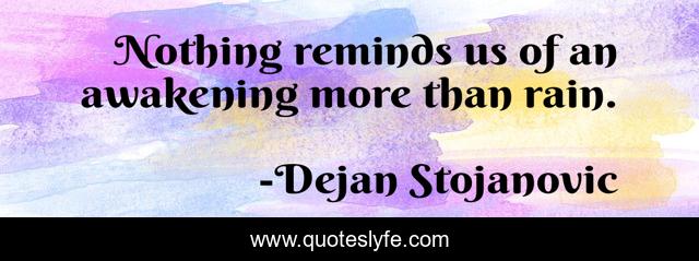 This page presents the quote "Nothing reminds us of an awakening more than rain.". Author of this quote is Dejan Stojanovic. This quote is about literature, dejan-stojanovic, poetry, rain, wisdom, quotes, awakening, quotes-to-live-by, thoughts,.