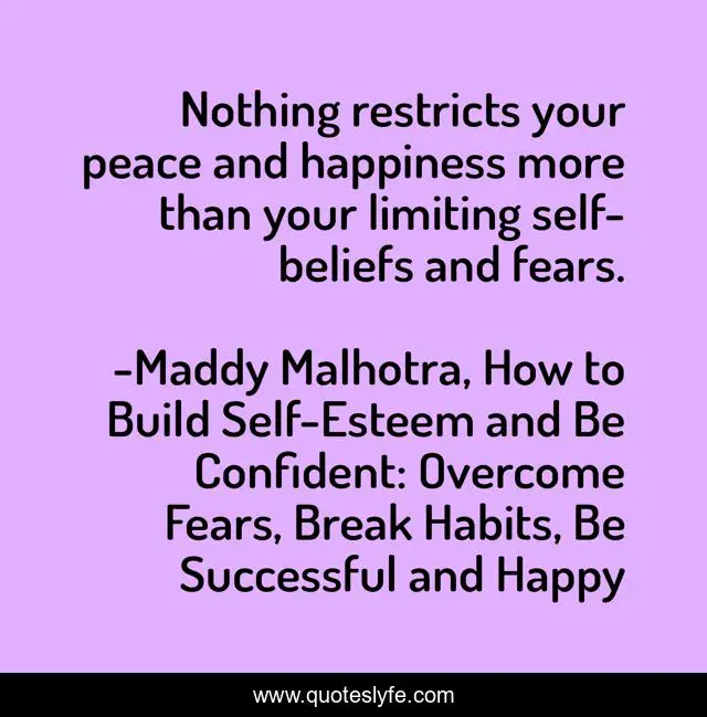 This page presents the quote "Nothing restricts your peace and happiness more than your limiting self-beliefs and fears.". Author of this quote is Maddy Malhotra, How to Build Self-Esteem and Be Confident: Overcome Fears, Break Habits, Be Successful and Happy. This quote is about peace-of-mind, self-love, doubts, success, mindset,.