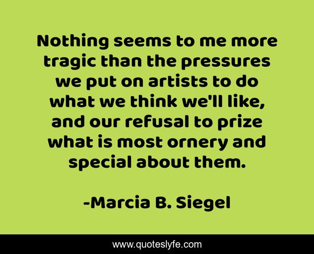 This page presents the quote "Nothing seems to me more tragic than the pressures we put on artists to do what we think we'll like, and our refusal to prize what is most ornery and special about them.". Author of this quote is Marcia B. Siegel. This quote is about art, artist,.
