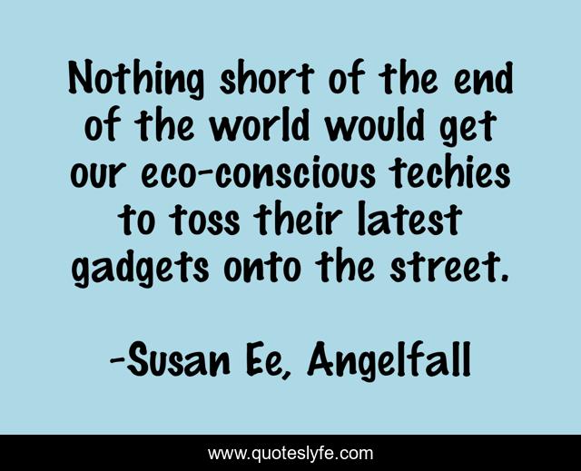 This page presents the quote "Nothing short of the end of the world would get our eco-conscious techies to toss their latest gadgets onto the street.". Author of this quote is Susan Ee, Angelfall. This quote is about environmentalism, consumerism, hypocrisy,.
