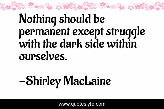 This page presents the quote "Nothing should be permanent except struggle with the dark side within ourselves.". Author of this quote is Shirley MacLaine. This quote is about positive, confidence, creating, change,.