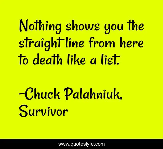 This page presents the quote "Nothing shows you the straight line from here to death like a list.". Author of this quote is Chuck Palahniuk, Survivor. This quote is about dark, humor,.