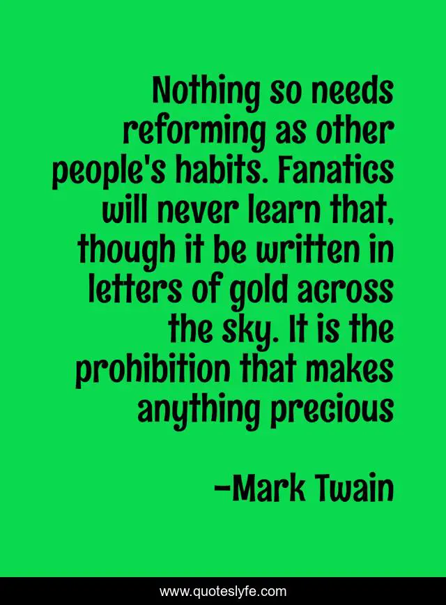 This page presents the quote "Nothing so needs reforming as other people's habits. Fanatics will never learn that, though it be written in letters of gold across the sky. It is the prohibition that makes anything precious". Author of this quote is Mark Twain. This quote is about true, prohibition,.