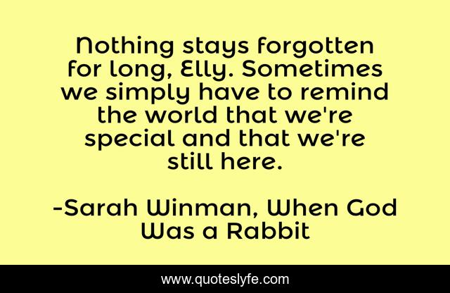 This page presents the quote "Nothing stays forgotten for long, Elly. Sometimes we simply have to remind the world that we're special and that we're still here.". Author of this quote is Sarah Winman, When God Was a Rabbit. .