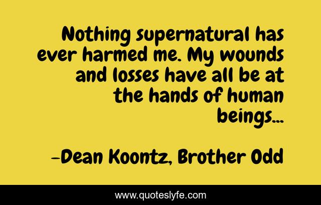 This page presents the quote "Nothing supernatural has ever harmed me. My wounds and losses have all be at the hands of human beings...". Author of this quote is Dean Koontz, Brother Odd. This quote is about human-beings, losses, supernatural, odd-thomas, wounds,.