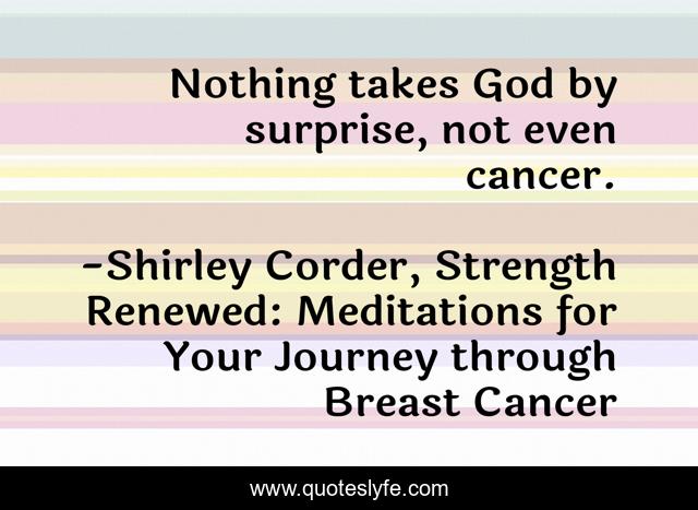 This page presents the quote "Nothing takes God by surprise, not even cancer.". Author of this quote is Shirley Corder, Strength Renewed: Meditations for Your Journey through Breast Cancer. This quote is about god, cancer, inspirational, enthusiasm,.