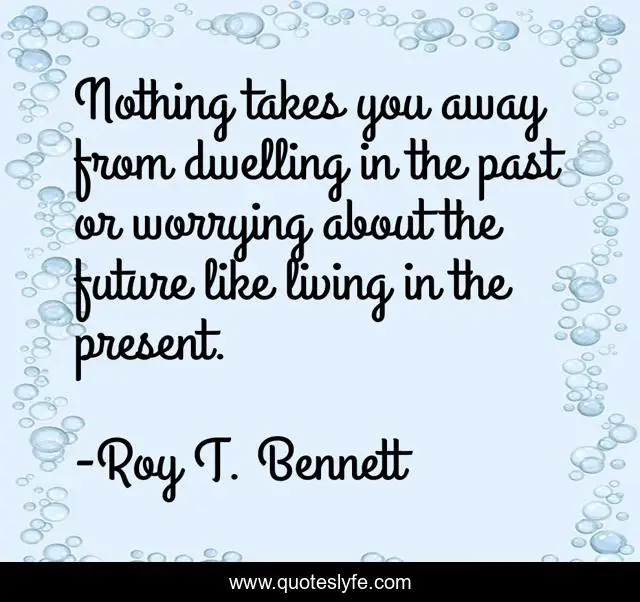 This page presents the quote "Nothing takes you away from dwelling in the past or worrying about the future like living in the present.". Author of this quote is Roy T. Bennett. This quote is about living, inspiring, living-in-the-present, inspire, positive, positive-affirmation, life, confidence, optimism,.