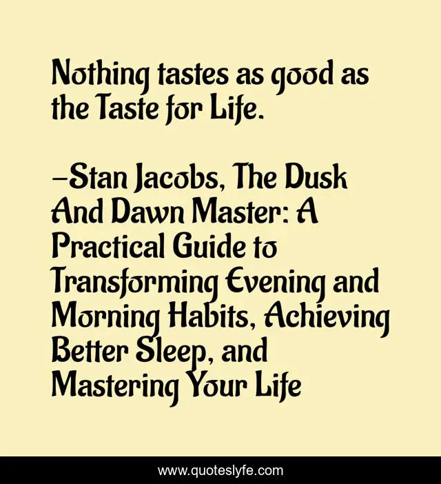 "Stan Jacobs, The Dusk And Dawn Master: A Practical Guide to Transforming Evening and Morning Habits, Achieving Better Sleep, and Mastering Your Life Quotes." Quoteslyfe.com, 2025. Fri. 05 Dec. 2025. <https://www.quoteslyfe.com/quote/Nothing-tastes-as-good-as-the-Taste-92525>.