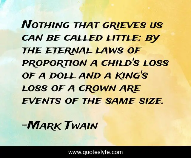 This page presents the quote "Nothing that grieves us can be called little: by the eternal laws of proportion a child's loss of a doll and a king's loss of a crown are events of the same size.". Author of this quote is Mark Twain. This quote is about grief, judgement, pain,.