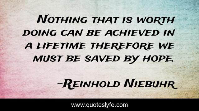 This page presents the quote "Nothing that is worth doing can be achieved in a lifetime therefore we must be saved by hope.". Author of this quote is Reinhold Niebuhr. This quote is about nothing, worth,.