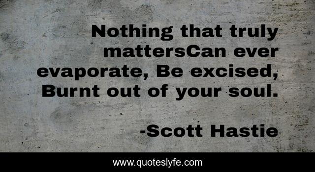 This page presents the quote "Nothing that truly mattersCan ever evaporate, Be excised, Burnt out of your soul.". Author of this quote is Scott Hastie. This quote is about spiritual, matters, excised, souls, evaporate, poetry, spirituality, soul, nothing,.