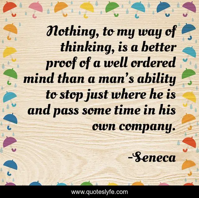 This page presents the quote "Nothing, to my way of thinking, is a better proof of a well ordered mind than a man’s ability to stop just where he is and pass some time in his own company.". Author of this quote is Seneca. This quote is about philosophy, stoic, stoicism,.