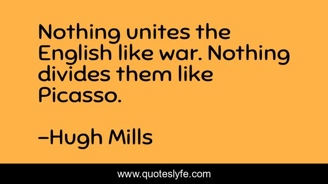 This page presents the quote "Nothing unites the English like war. Nothing divides them like Picasso.". Author of this quote is Hugh Mills. This quote is about , england, k, u,.