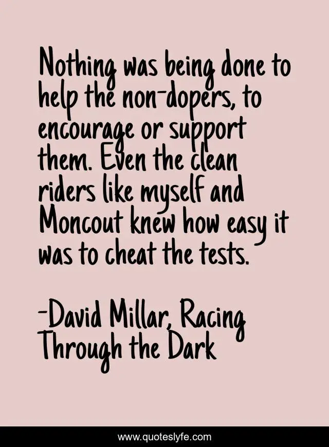 This page presents the quote "Nothing was being done to help the non-dopers, to encourage or support them. Even the clean riders like myself and Moncout knew how easy it was to cheat the tests.". Author of this quote is David Millar, Racing Through the Dark. This quote is about support, betrayal, encouragement, sports, purity, doping,.