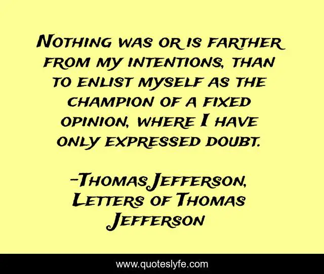 This page presents the quote "Nothing was or is farther from my intentions, than to enlist myself as the champion of a fixed opinion, where I have only expressed doubt.". Author of this quote is Thomas Jefferson, Letters of Thomas Jefferson. This quote is about intention, doubt, champion,.