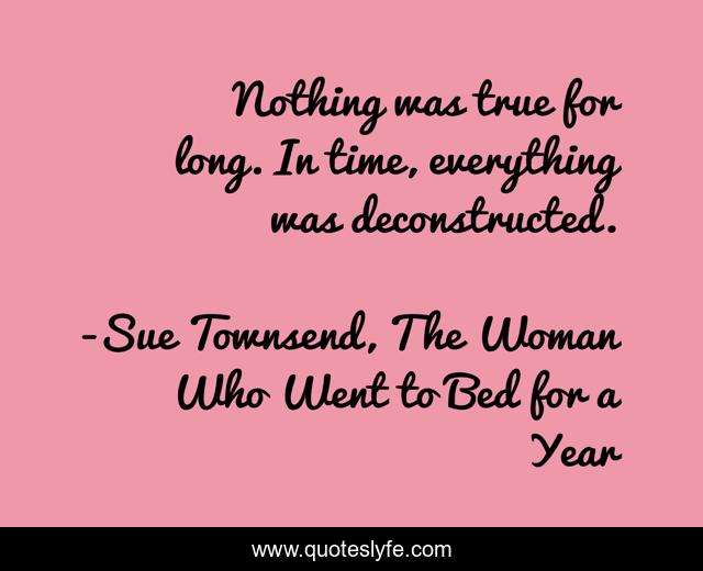This page presents the quote "Nothing was true for long. In time, everything was deconstructed.". Author of this quote is Sue Townsend, The Woman Who Went to Bed for a Year. This quote is about changes, truth, time,.