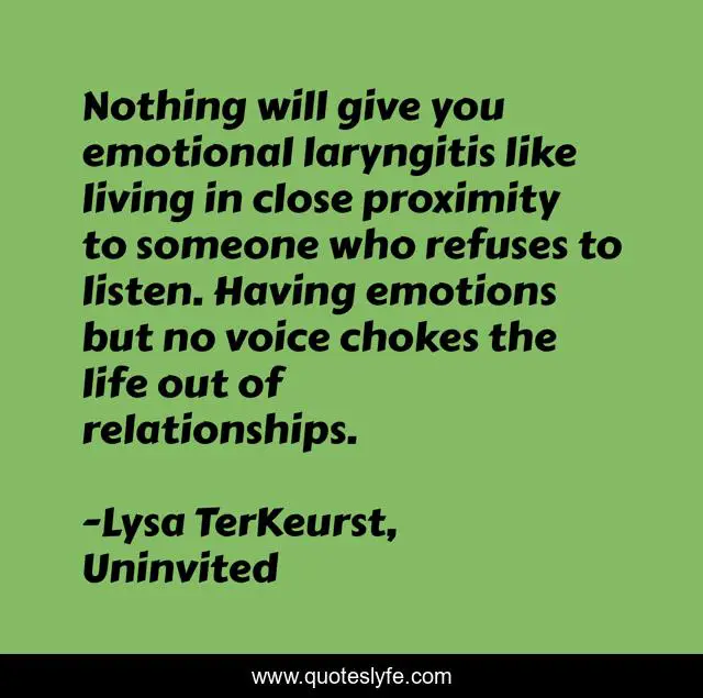 "Lysa TerKeurst, Uninvited Quotes." Quoteslyfe.com, 2025. Sat. 06 Dec. 2025. <https://www.quoteslyfe.com/quote/Nothing-will-give-you-emotional-laryngitis-like-28915>.