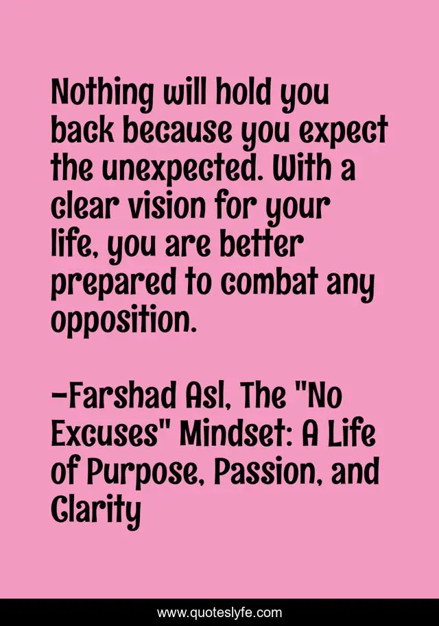 This page presents the quote "Nothing will hold you back because you expect the unexpected. With a clear vision for your life, you are better prepared to combat any opposition.". Author of this quote is Farshad Asl, The "No Excuses" Mindset: A Life of Purpose, Passion, and Clarity. This quote is about combat, clarity, nothing-can-hold-you-back, expect-the-unexpected, vision,.