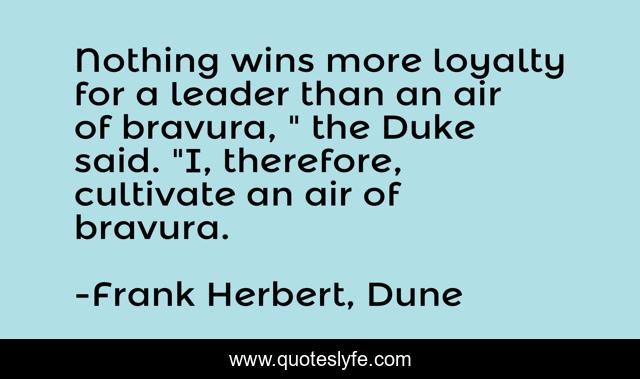 This page presents the quote "Nothing wins more loyalty for a leader than an air of bravura, " the Duke said. "I, therefore, cultivate an air of bravura.". Author of this quote is Frank Herbert, Dune. This quote is about cultivate, air, loyalty, bravura, leader,.