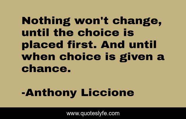 This page presents the quote "Nothing won't change, until the choice is placed first. And until when choice is given a chance.". Author of this quote is Anthony Liccione. This quote is about desire, life, priorities, choice, chance, choosing, change,.