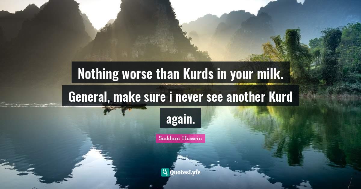 This page presents the quote "Nothing worse than Kurds in your milk. General, make sure i never see another Kurd again.". Author of this quote is Saddam Hussein. This quote is about milk, dictator, kurds,.