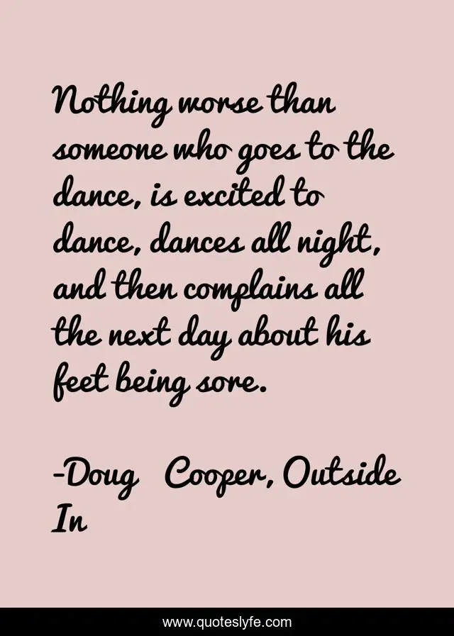 This page presents the quote "Nothing worse than someone who goes to the dance, is excited to dance, dances all night, and then complains all the next day about his feet being sore.". Author of this quote is Doug Cooper, Outside In. This quote is about put-in-bay, dancer-fever, dance, sore, outside-in, addiction, identity,.