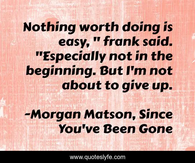 "Morgan Matson, Since You've Been Gone Quotes." Quoteslyfe.com, 2025. Sat. 06 Dec. 2025. <https://www.quoteslyfe.com/quote/Nothing-worth-doing-is-easy-frank-said-165948>.