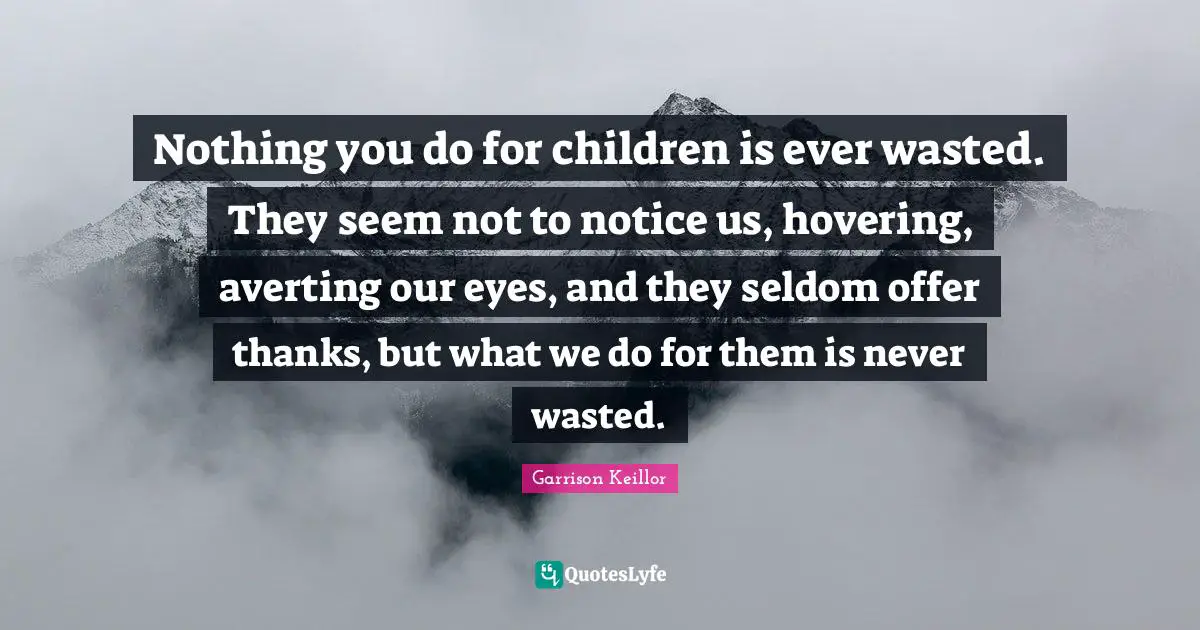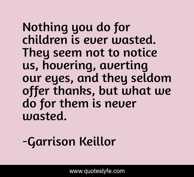 This page presents the quote "Nothing you do for children is ever wasted. They seem not to notice us, hovering, averting our eyes, and they seldom offer thanks, but what we do for them is never wasted.". Author of this quote is Garrison Keillor. This quote is about eyes, children,.