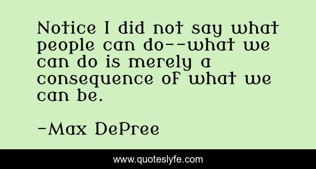 This page presents the quote "Notice I did not say what people can do--what we can do is merely a consequence of what we can be.". Author of this quote is Max DePree. This quote is about leadership, art, humanity,.