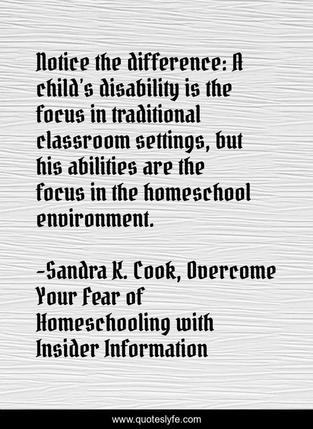 "Sandra K. Cook, Overcome Your Fear of Homeschooling with Insider Information Quotes." Quoteslyfe.com, 2025. Fri. 05 Dec. 2025. <https://www.quoteslyfe.com/quote/Notice-the-difference-A-child-s-disability-185705>.