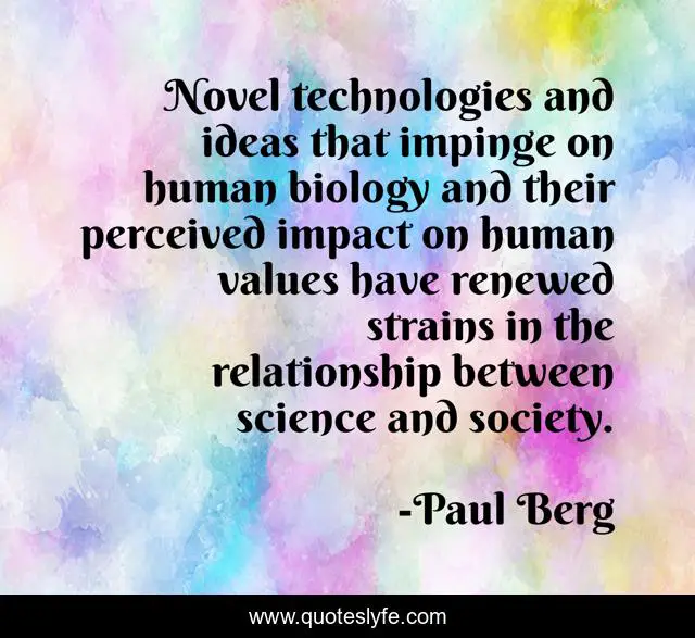This page presents the quote "Novel technologies and ideas that impinge on human biology and their perceived impact on human values have renewed strains in the relationship between science and society.". Author of this quote is Paul Berg. This quote is about society, ideas, relationship,.