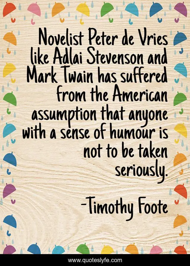 This page presents the quote "Novelist Peter de Vries like Adlai Stevenson and Mark Twain has suffered from the American assumption that anyone with a sense of humour is not to be taken seriously.". Author of this quote is Timothy Foote. This quote is about humorists, humour,.