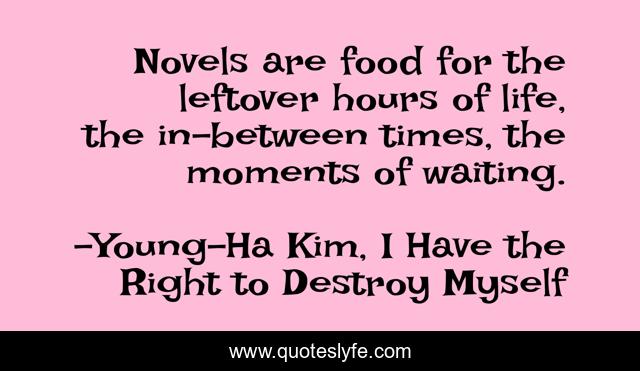 This page presents the quote "Novels are food for the leftover hours of life, the in-between times, the moments of waiting.". Author of this quote is Young-Ha Kim, I Have the Right to Destroy Myself. This quote is about korea, inspirational, young-ha, introspection, books, kim, enthusiasm, korean,.