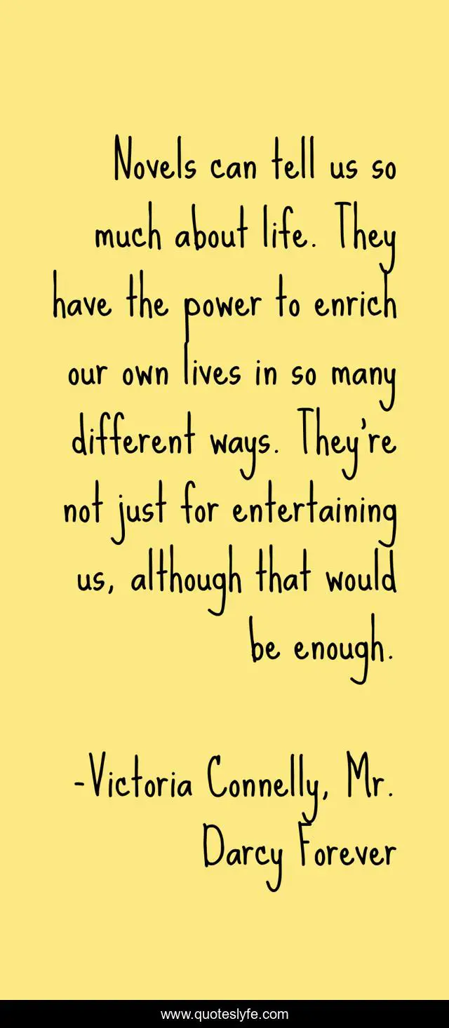 This page presents the quote "Novels can tell us so much about life. They have the power to enrich our own lives in so many different ways. They're not just for entertaining us, although that would be enough.". Author of this quote is Victoria Connelly, Mr. Darcy Forever. .