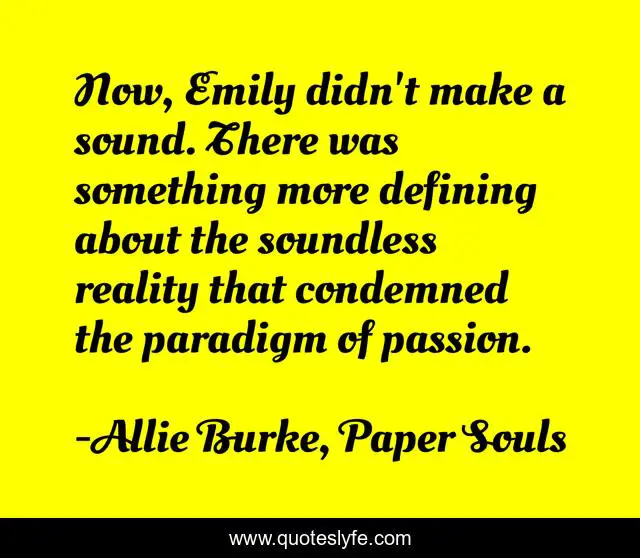 This page presents the quote "Now, Emily didn't make a sound. There was something more defining about the soundless reality that condemned the paradigm of passion.". Author of this quote is Allie Burke, Paper Souls. This quote is about sound, quiet, reality, schizophrenia, passion, mental-illness, paradigm, silence, soundless,.