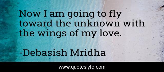 This page presents the quote "Now I am going to fly toward the unknown with the wings of my love.". Author of this quote is Debasish Mridha. This quote is about philosophy, love, the-unknown, debasish-mridha, quotes, wings-of-my-love, inspirational, enthusiasm, debasish-mridha-m-d,.