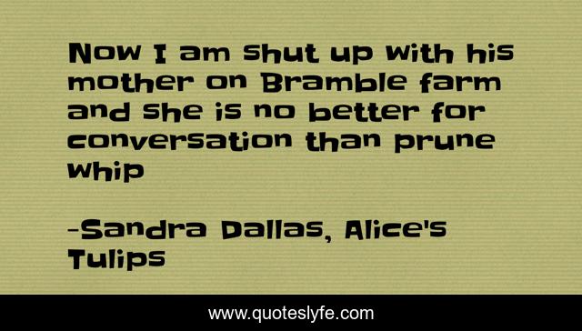 This page presents the quote "Now I am shut up with his mother on Bramble farm and she is no better for conversation than prune whip". Author of this quote is Sandra Dallas, Alice's Tulips. This quote is about funny, comedy,.