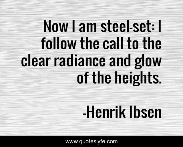 This page presents the quote "Now I am steel-set: I follow the call to the clear radiance and glow of the heights.". Author of this quote is Henrik Ibsen. .