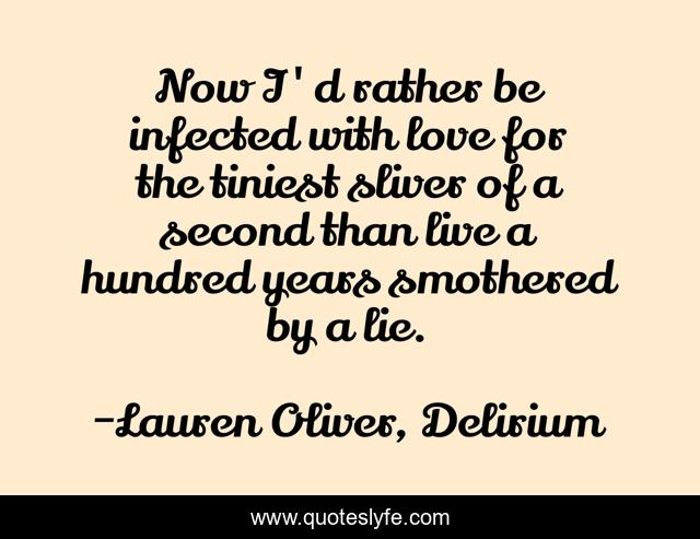 This page presents the quote "Now I'd rather be infected with love for the tiniest sliver of a second than live a hundred years smothered by a lie.". Author of this quote is Lauren Oliver, Delirium. This quote is about love, affection,.