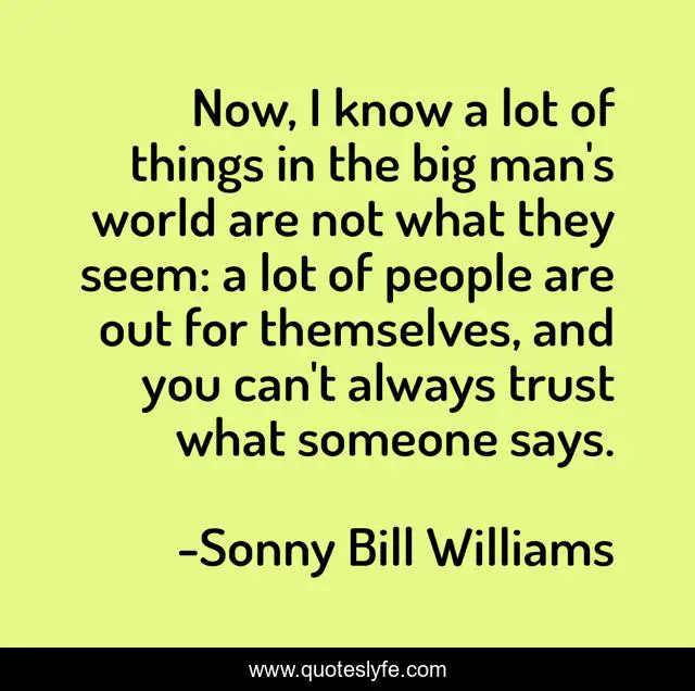 This page presents the quote "Now, I know a lot of things in the big man's world are not what they seem: a lot of people are out for themselves, and you can't always trust what someone says.". Author of this quote is Sonny Bill Williams. This quote is about world, man, people,.