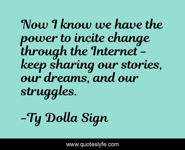 This page presents the quote "Now I know we have the power to incite change through the Internet - keep sharing our stories, our dreams, and our struggles.". Author of this quote is Ty Dolla Sign. This quote is about change, power, internet,.