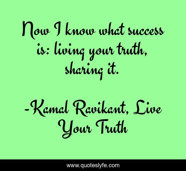 This page presents the quote "Now I know what success is: living your truth, sharing it.". Author of this quote is Kamal Ravikant, Live Your Truth. This quote is about dharma, happiness, self-awareness, success, truth,.