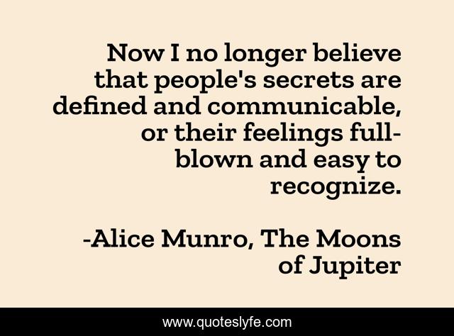 This page presents the quote "Now I no longer believe that people's secrets are defined and communicable, or their feelings full-blown and easy to recognize.". Author of this quote is Alice Munro, The Moons of Jupiter. .