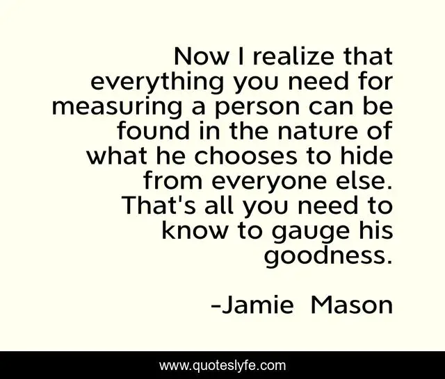 This page presents the quote "Now I realize that everything you need for measuring a person can be found in the nature of what he chooses to hide from everyone else. That's all you need to know to gauge his goodness.". Author of this quote is Jamie Mason. .