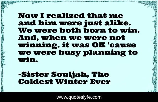 This page presents the quote "Now I realized that me and him were just alike. We were both born to win. And, when we were not winning, it was OK 'cause we were busy planning to win.". Author of this quote is Sister Souljah, The Coldest Winter Ever. .