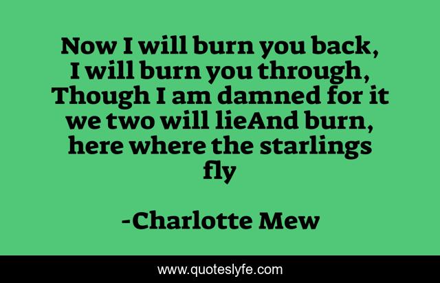This page presents the quote "Now I will burn you back, I will burn you through, Though I am damned for it we two will lieAnd burn, here where the starlings fly". Author of this quote is Charlotte Mew. This quote is about fire, burn, love, affection,.