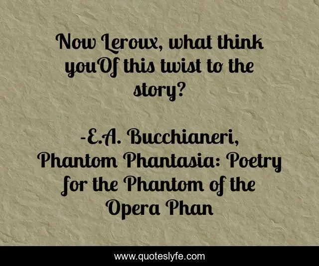 This page presents the quote "Now Leroux, what think youOf this twist to the story?". Author of this quote is E.A. Bucchianeri, Phantom Phantasia: Poetry for the Phantom of the Opera Phan. This quote is about phantom, poem, story, humor, humour, poetry, gaston-leroux, opera-ghost, leroux,.