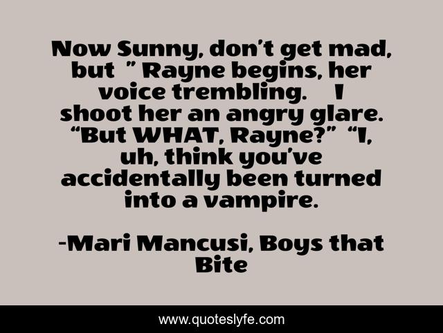 This page presents the quote "Now Sunny, don’t get mad, but …” Rayne begins, her voice trembling. I shoot her an angry glare. “But WHAT, Rayne?” “I, uh, think you’ve accidentally been turned into a vampire.". Author of this quote is Mari Mancusi, Boys that Bite. This quote is about ya, paranormal-romance, vampires,.