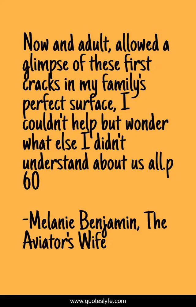 This page presents the quote "Now and adult, allowed a glimpse of these first cracks in my family's perfect surface, I couldn't help but wonder what else I didn't understand about us all.p 60". Author of this quote is Melanie Benjamin, The Aviator's Wife. .